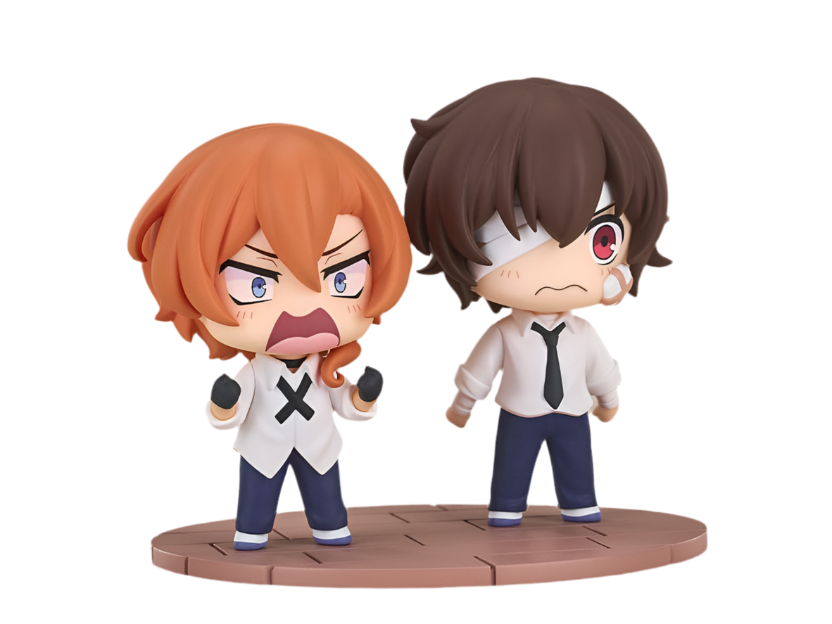 Dieses Figuren-Set zeigt Osamu Dazai und Chuya Nakahara in ihrem niedlichen Wan! Chibi-Design aus Bungo Stray Dogs Wan! – ein Muss für Fans der Serie!