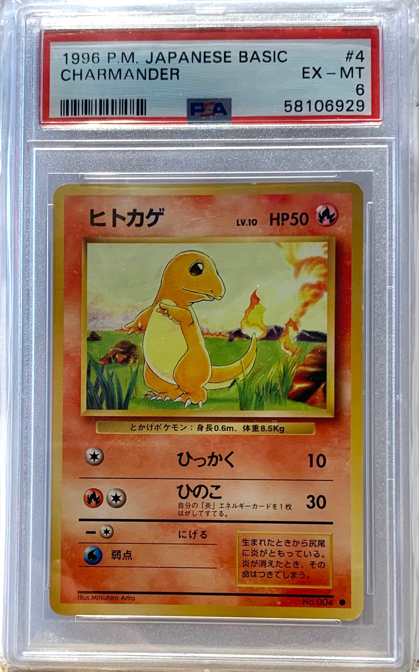 Sichere Dir Charmander #4 aus der Pokémon-Kartenserie, bewertet mit der Note 6. Eine wahre Rarität für Sammler und Investoren.